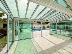 Elle se compose d'une grande pièce de vie lumineuse de 50 m² avec cuisine équipée composée de matériaux haut de gamme, prolongée par une véranda de 25 m² en aluminium.