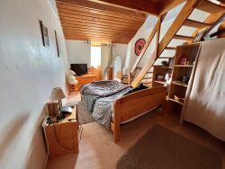 À l'étage, une mezzanine apporte un espace supplémentaire (coin lecture, espace jeux ou télétravail) et dessert trois grandes chambres, parfaites pour une famille, ainsi qu'une salle d'eau.