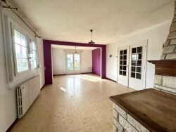 Hall d'entrée, grand séjour spacieux et lumineux avec insert bois, cuisine équipée, buanderie/chaufferie, WC, salle de bains avec douche, trois chambres.