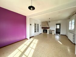 Hall d'entrée, grand séjour spacieux et lumineux avec insert bois, cuisine équipée, buanderie/chaufferie, WC, salle de bains avec douche, trois chambres.