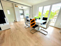 À l'étage : - Cuisine équipée ouverte sur salon/séjour lumineux avec accès balcon. - 2 chambres de 12m2. - WC séparés. - Salle d'eau avec douche.
