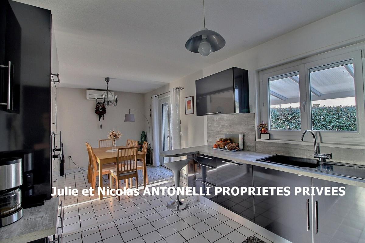 D'une superficie d'environ 90m² implantée sur un terrain plat de 753 m², elle est composée à l'étage d'un séjour avec cuisine ouverte avec accès sur une terrasse, deux chambres une salle de douches et un toilette. Au sous sol, une grande chambre, une buanderie et un toilette. Un atelier de 17 m² (isolé) et un garage de 34 m² avec porte motorisée viennent compléter ce bien.