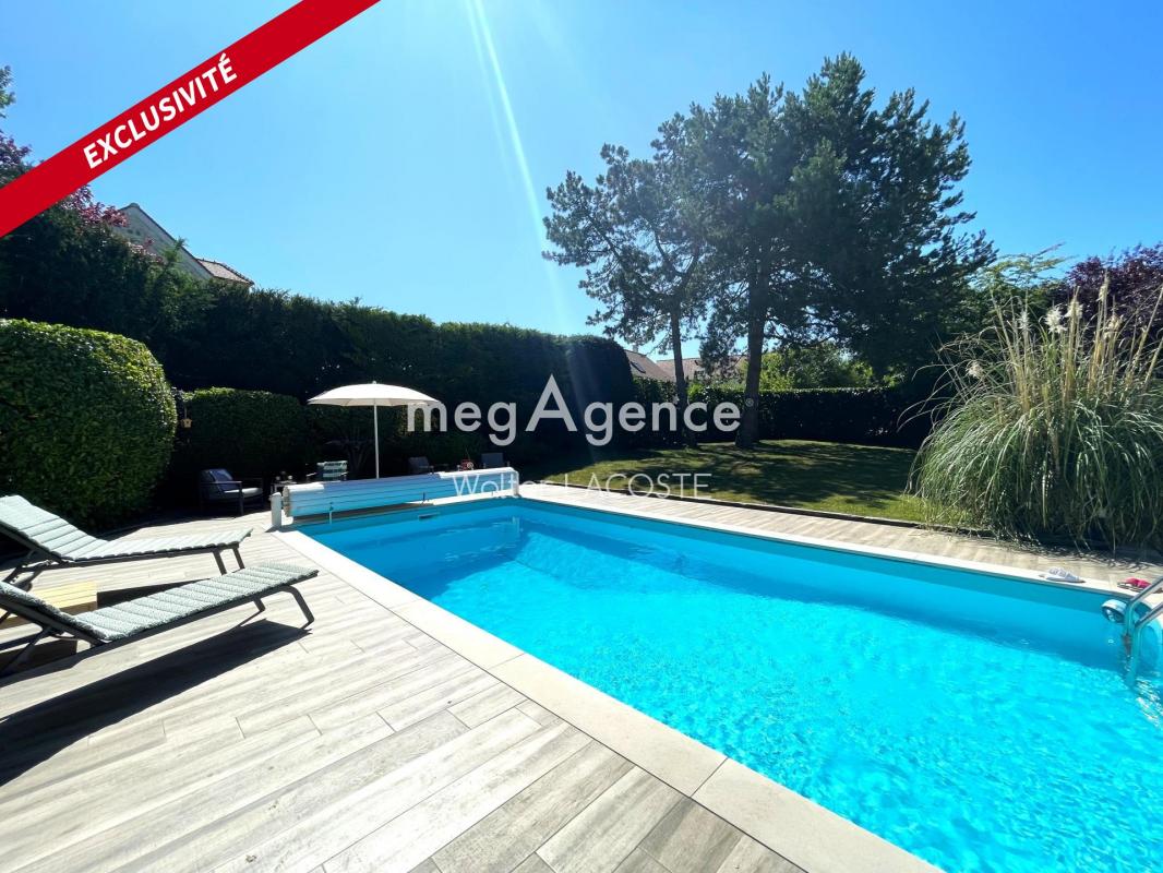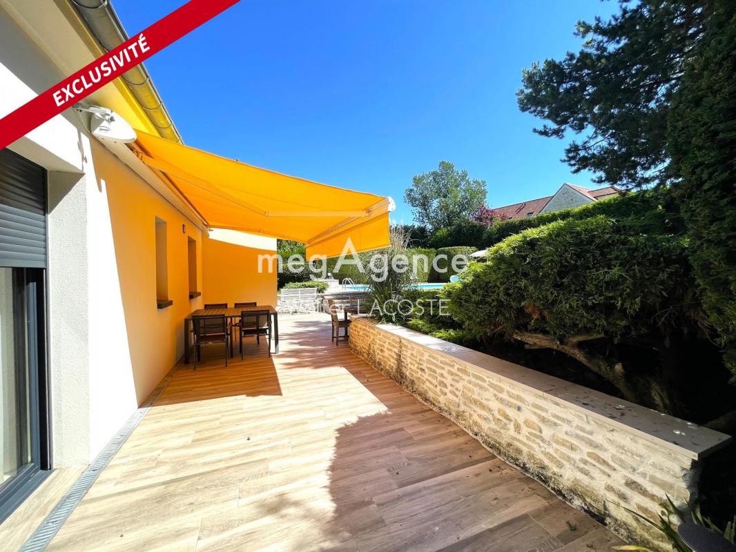 SAINT NOM LA BRETÈCHE. Sur un terrain de 905m², Jolie maison lumineuse, au calme et individuelle de 9 pièces principales comprenant entrée, triple séjour sur terrasse et jardin orientés Sud/ouest, salle à manger, cuisine dinatoire, une chambre avec salle d'eau, wc séparé. A l'étage : 5 chambres dont une parentale avec salle de bains balnéo, wc et dressing, salle de bains, wc. Garage double, buanderie et remise. Résidence avec tennis et piscine !