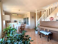 Au rez-de-chaussée, l'entrée dessert un salon/salle à manger de 38 m² (avec grands rangements) avec cheminée en pierre et accès au balcon, une cuisine équipée et aménagée ouverte sur une véranda de 12 m² environ plein Ouest, deux chambres avec placards, une salle d'eau et des toilettes séparés.