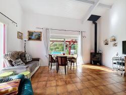 Cette maison lumineuse et bien entretenue se compose d'une entrée, d'un séjour/salle à manger ouvrant sur la terrasse et la piscine, d'une cuisine indépendante, et de trois chambres. Une mezzanine offre un espace polyvalent pouvant être aménagé en bureau ou en chambre supplémentaire selon les besoins.