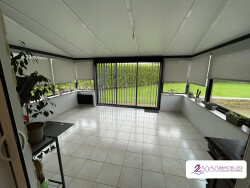 Elle est composée, au rez-de-chaussée d'une grande pièce de vie ouverte sur la cuisine équipée, d'une magnifique véranda très lumineuse construite en 2013, d'une chambre, d'un WC et d'un garage fait en 2020 avec porte automatique.
