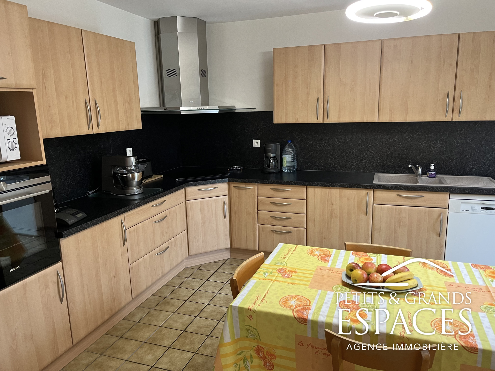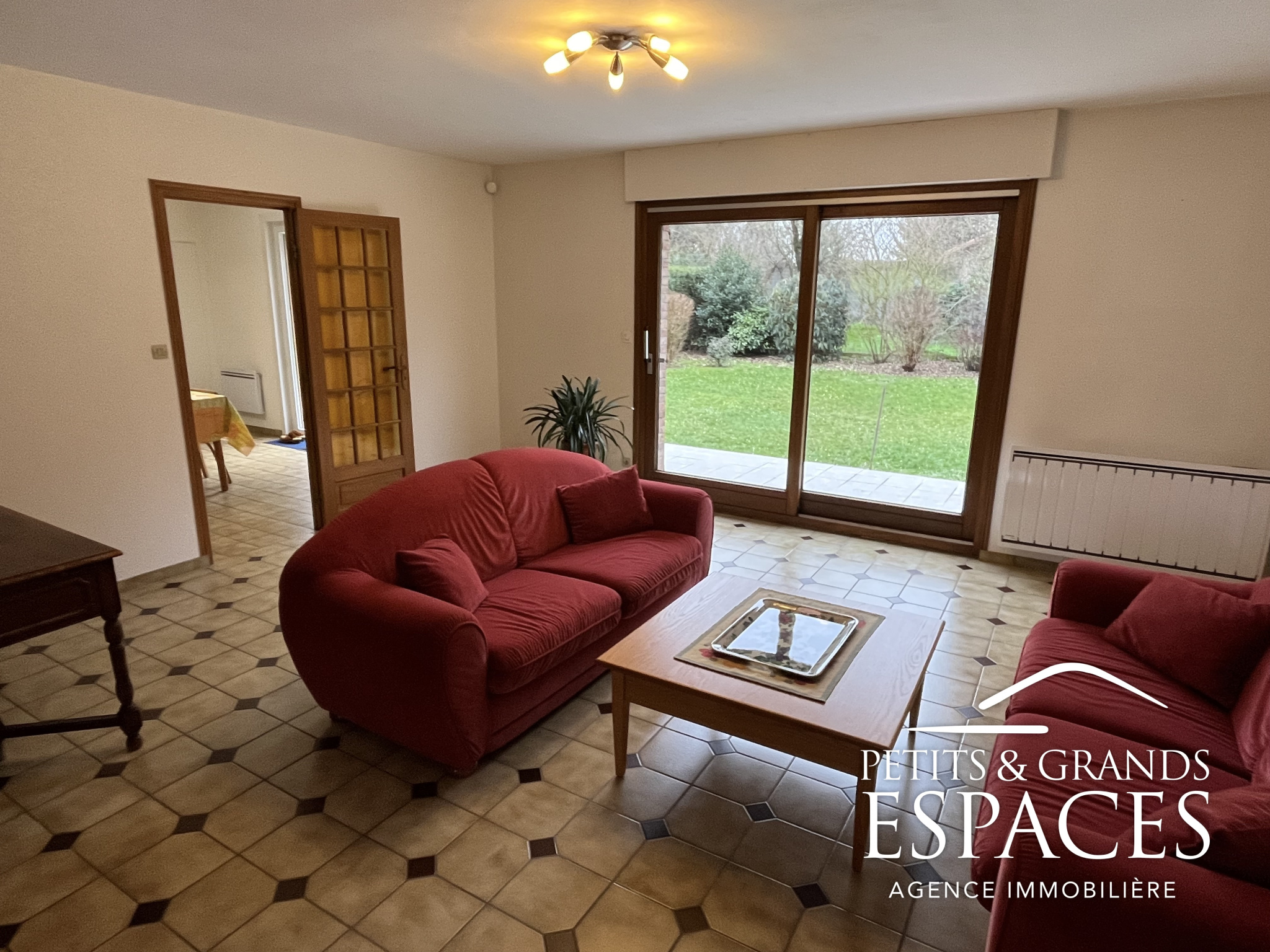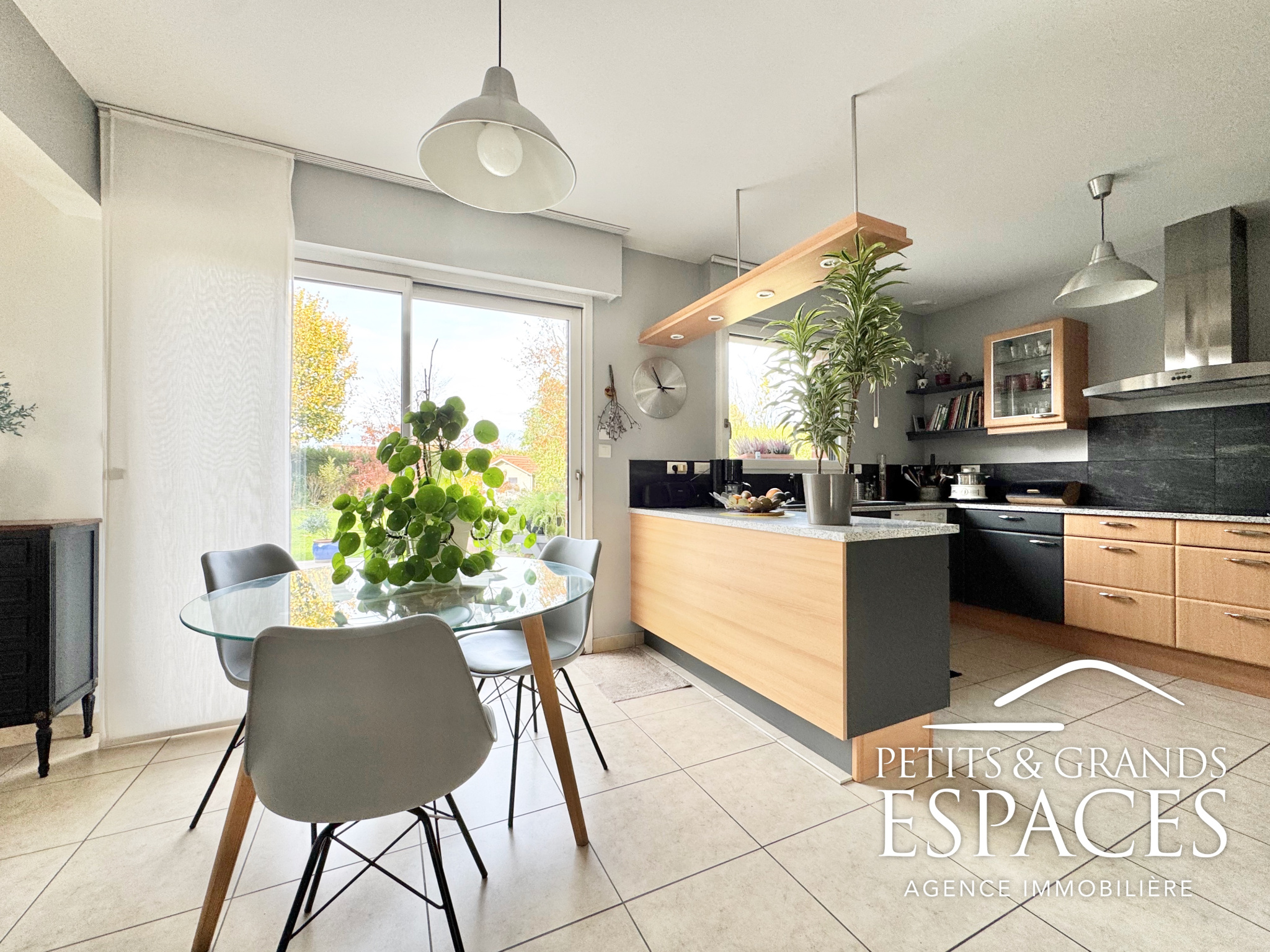 Hall d'entrée avec placard WC indépendant avec lave-mains Espace de vie ouvert de 62 m2 : cuisine équipé , salle à manger lumineuse , salon chaleureux avec vue sur la terrasse et poêle à granulés Garage double isolé, carrelé, porte sectionnelle motorisée