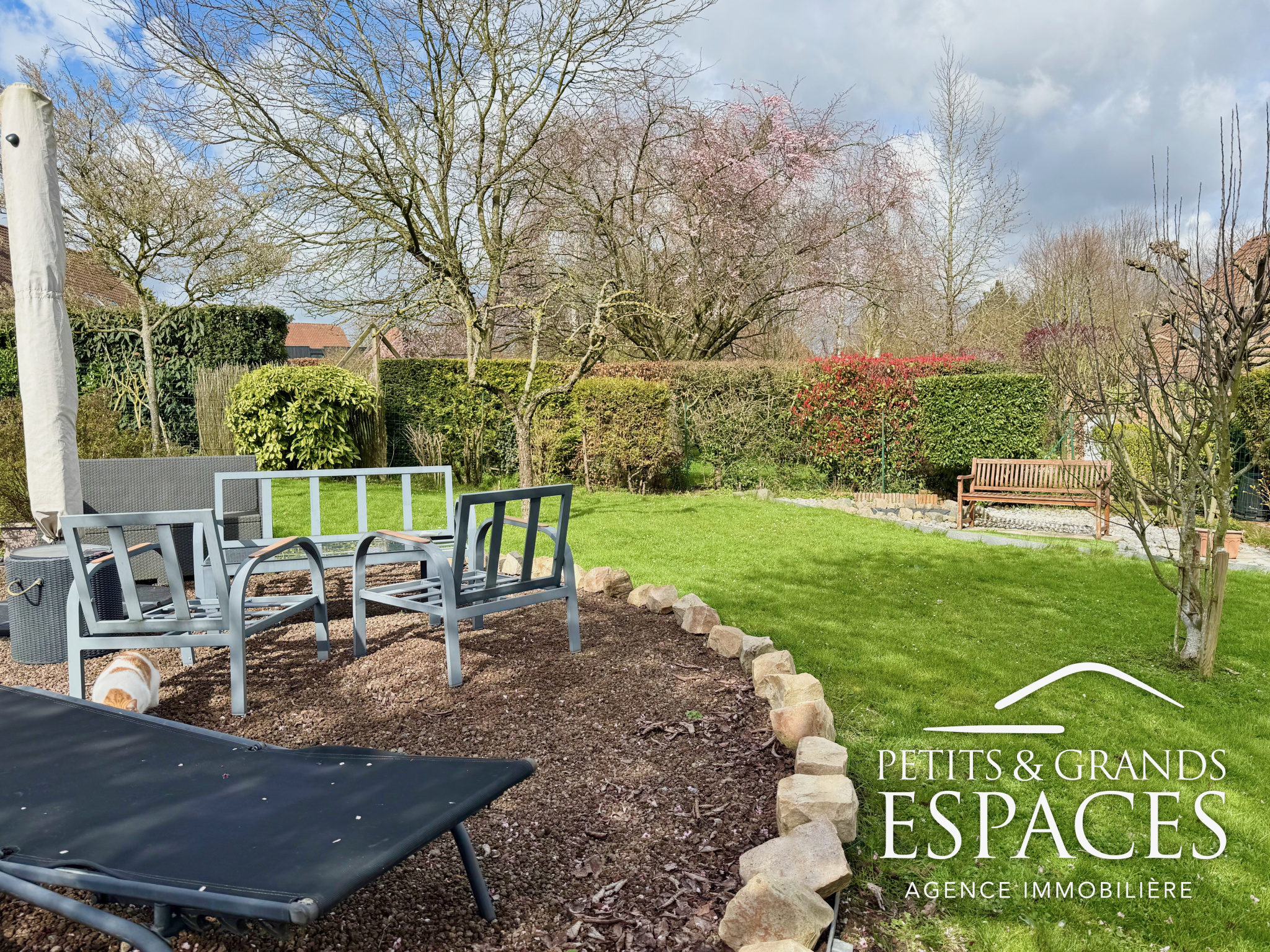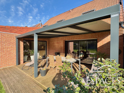 Portail coulissant et clôture en façade Jardin clos, arboré et soigneusement entretenu Passages latéraux de chaque côté Terrasse bois de 35 m2 avec pergola aluminium Exposition Ouest Carport aluminium (compatible camping-car) Abri de jardin aluminium attenant
