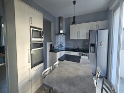 Le rez-de-chaussée surélevé s'ouvre sur une cuisine aménagée et équipée, prolongée par un grand balcon doté d'un store banne, et communique directement avec le salon-séjour. Deux chambres, une salle de bains et des toilettes complètent ce niveau. À l'étage, trois chambres supplémentaires, une salle d'eau et des toilettes permettent d'accueillir aisément une grande famille.