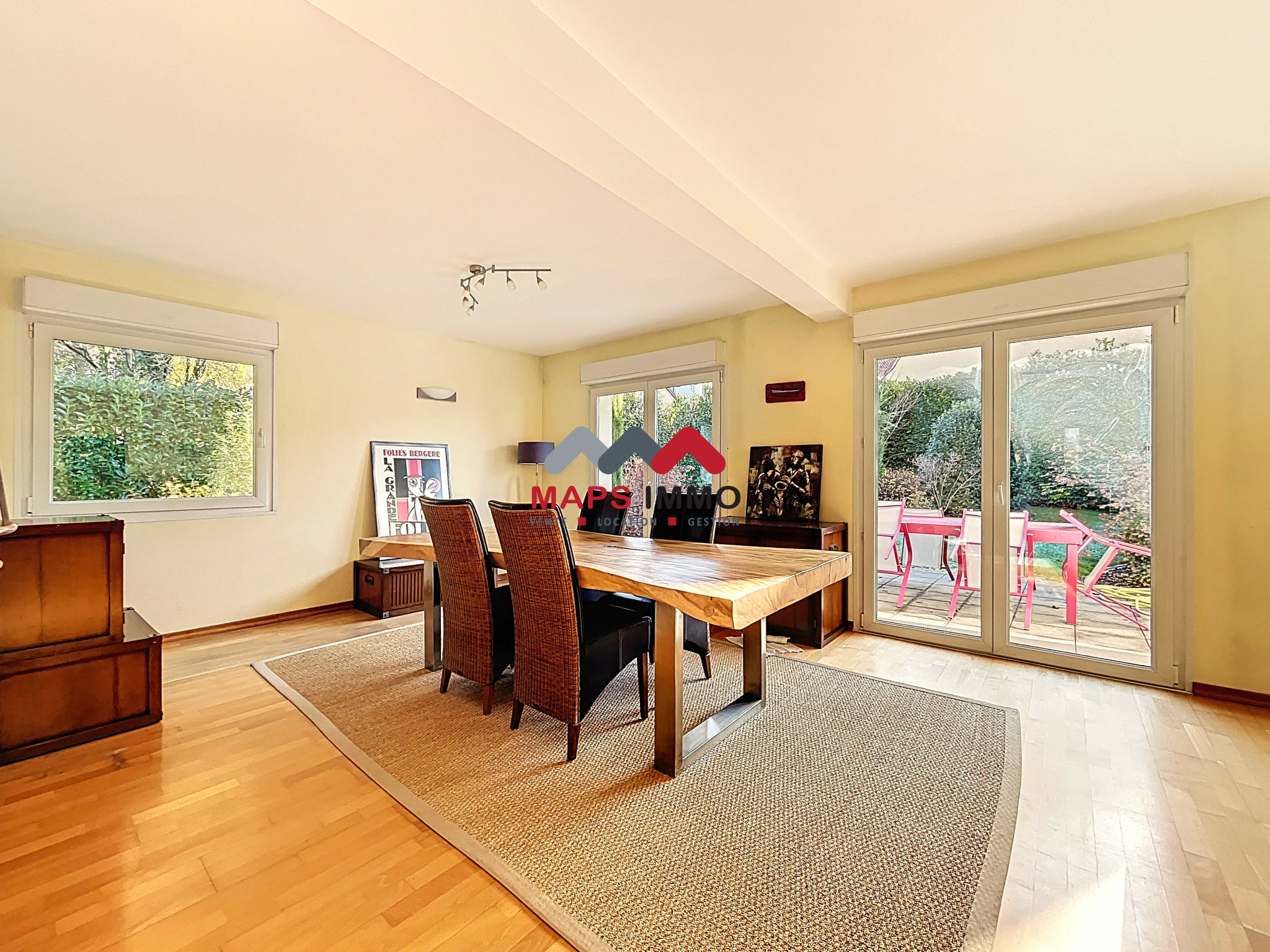 Espace de vie baigné de lumière : Un double séjour/salle à manger de 43 m² ouvert sur le jardin, complété par une cuisine contemporaine équipée de standing.