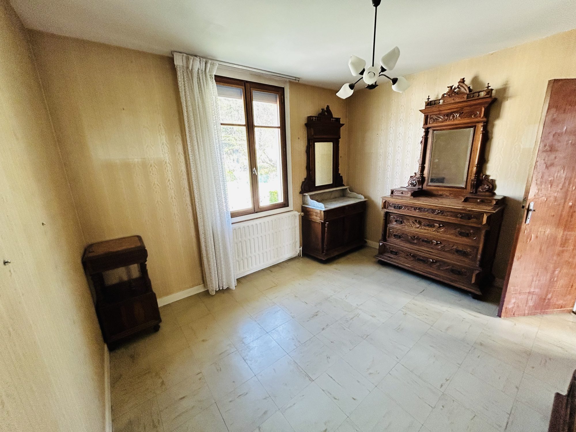 Intérieur spacieux et lumineux : Un séjour avec plafond cathédrale poutres apparentes baigné de lumière et ouvert sur un grand salon doté d'un poêle à bois. Orientation Sud Ouest. Une grande cuisine équipée et aménagée indépendante, un bureau, une salle de bain à moderniser, une buanderie et de nombreux rangements.
