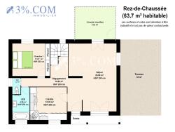 ***RDC : Hall d'entrée _ Séjour (25 m2) sur véranda (12 m2) _Cuisine aménagée & équipée _ 1 chambre _ 1 SDB _ 1 WC _ 1 Terrasse (20 m2)