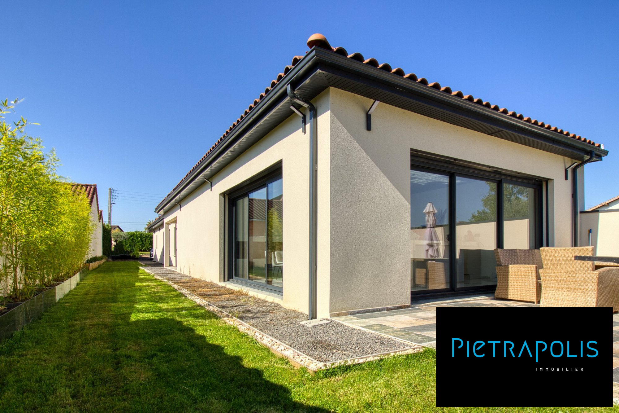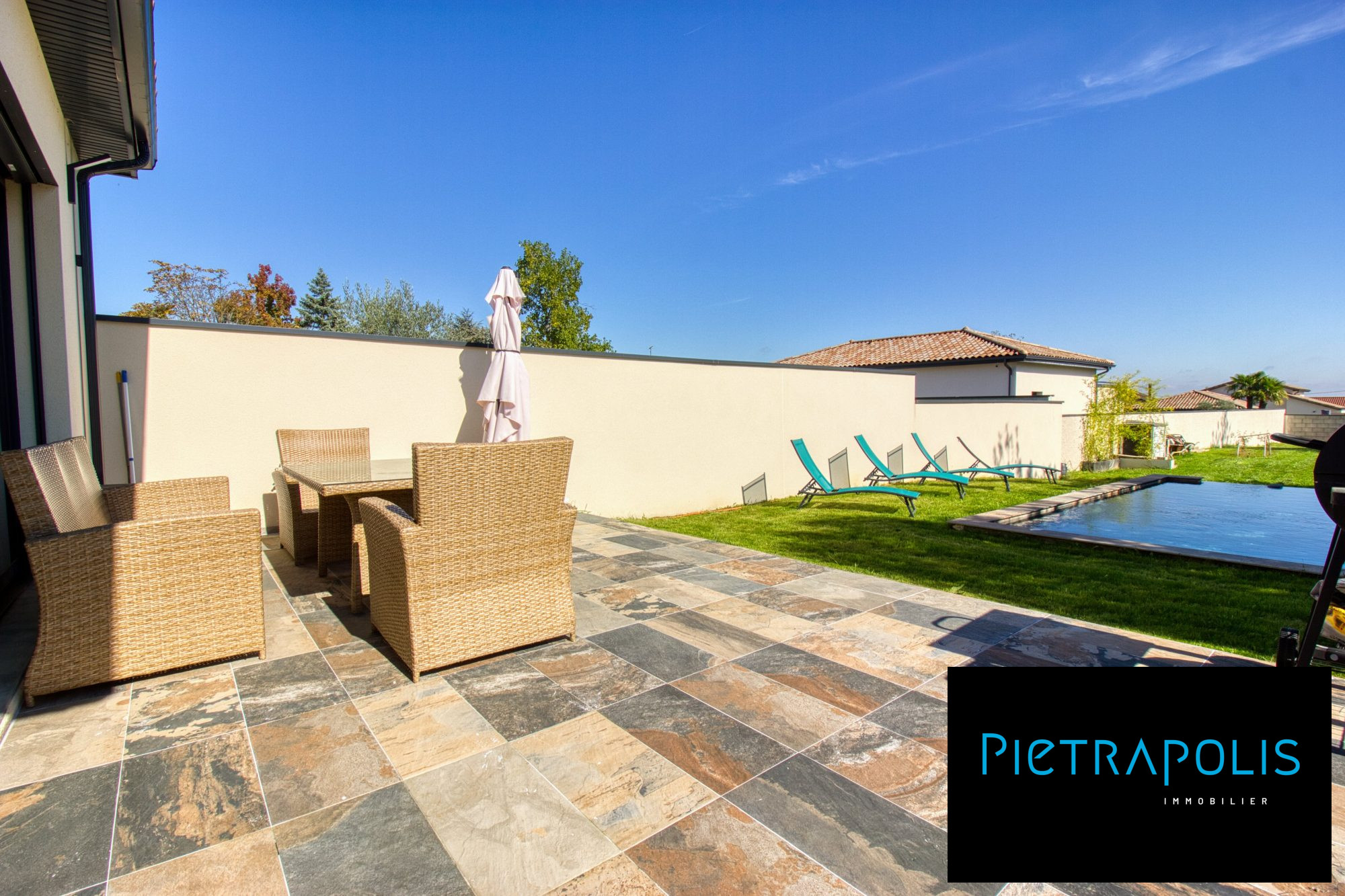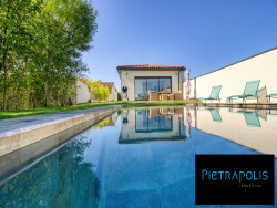 Rez-de-jardin : Un appartement T2, 63m2 environ, avec entrée indépendante, idéal pour accueillir des amis ou envisager une activité locative (chambres d'hôtes, location meublée, profession libérale). Il comprend une cuisine équipée ouverte sur le séjour, une suite parentale (avec salle d'eau, dressing et WC indépendant). Un accès direct à la terrasse et à la piscine (8 x 4 m).