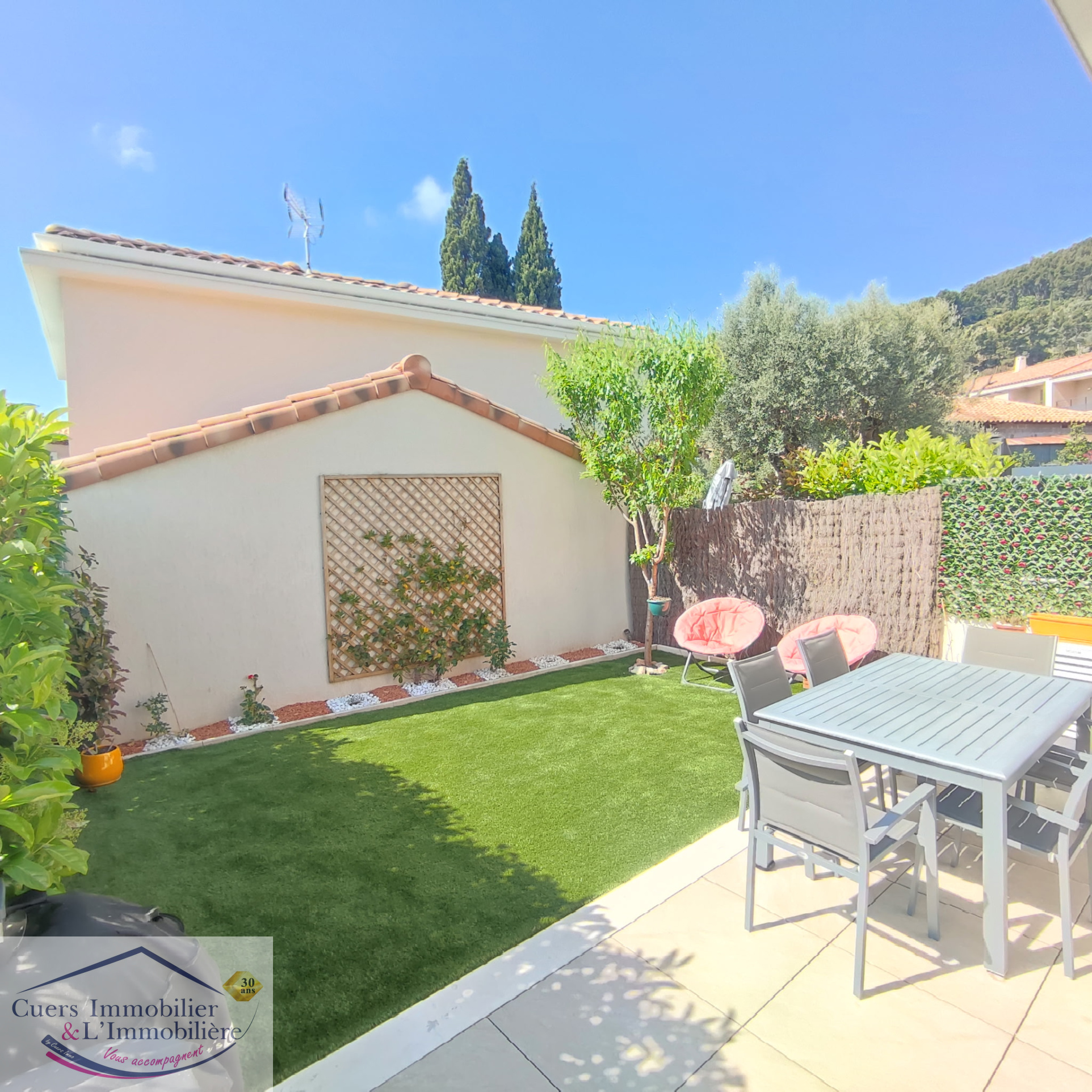 Pour l'extérieur, la maison est construite sur un terrain de 3.224 m² avec vue sur le Massif de la Sainte Baume.