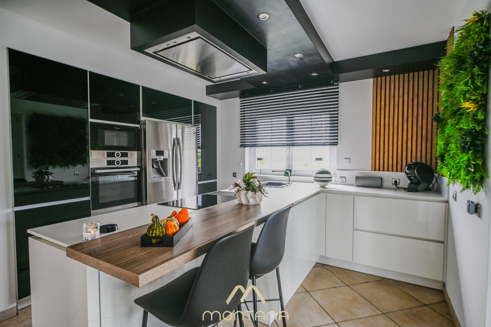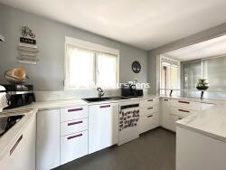 La maison principale, d'environ 130 m2, comprend une entrée qui distribue une grande cuisine entièrement équipée avec nombreux rangements. Dans le prolongement, une pièce de vie avec partie salon et partie salle à manger donnant à la terrasse et au jardin.