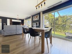 La maison s'organise autour d'un séjour lumineux de 36 m², ouvert sur une cuisine américaine aménagée et équipée, formant un espace de vie convivial et parfaitement adapté au quotidien. L'espace nuit comprend trois chambres, avec la possibilité d'en créer une quatrième selon les besoins, ainsi qu'une salle de bains complète équipée d'une douche, d'une baignoire et d'une double vasque.