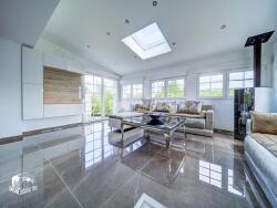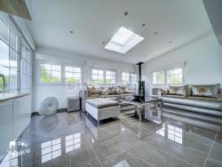 La pièce de vie principale de 50 m² bénéficie d'une luminosité exceptionnelle grâce à ses larges ouvertures donnant sur une terrasse plein sud et un jardin paysager parfaitement entretenu.