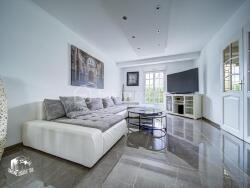 La pièce de vie principale de 50 m² bénéficie d'une luminosité exceptionnelle grâce à ses larges ouvertures donnant sur une terrasse plein sud et un jardin paysager parfaitement entretenu.