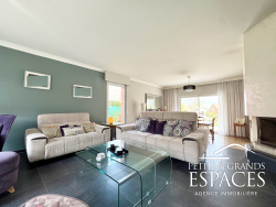 Hall d'entrée avec vide sur hall, escalier et vestiaire Spacieux salon-séjour traversant de 42 m2 agrémenté d'une cheminée avec insert tubé et ouvrant sur la terrasse Cuisine semi-ouverte de 24 m2, entièrement aménagée et équipée (Schmidt) avec espace repas et accès direct à la terrasse Chambre ou bureau de 14 m2, permettant une vie de plain-pied WC indépendant avec point d'eau Buanderie / chaufferie attenante à la cuisine avec accès au jardin Garage intégré carrelé et isolé avec porte sectionnelle motorisée Cave saine