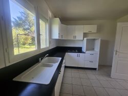Une cuisine indépendante meublée et équipée avec accès garage et coin buanderie, 2 chambres dont une avec rangements, une salle d'eau avec douche meuble double vasque. WC indépendants.