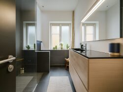 Les placards sur mesure, les peintures bio sans solvant et les parquets traités naturellement offrent un intérieur sain et soigné.