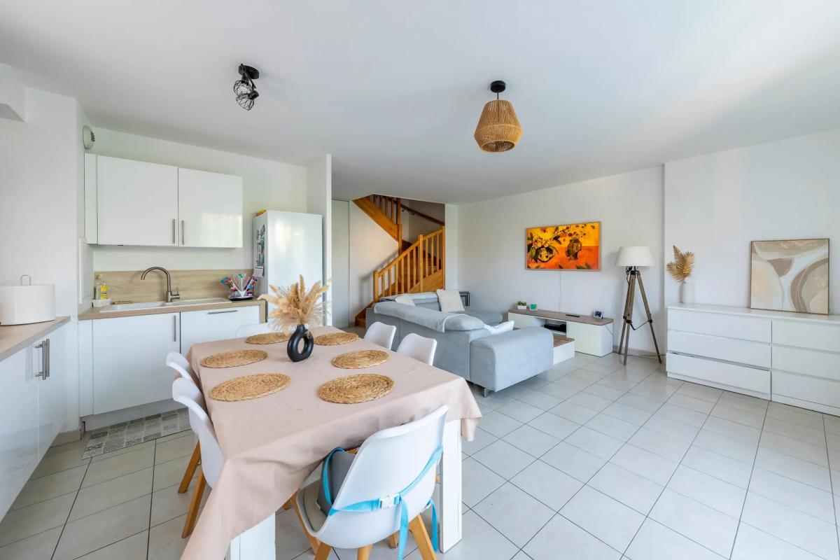 - Au rez-de-chaussée: entrée avec rangements, une belle pièce de vie spacieuse et lumineuse de plus de 34m2, un cuisine ouverte sur le séjour et communiquant avec le garage, un WC.