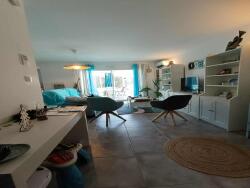 Une grande cuisine équipée ouverte sur un agréable salon avec baie vitrée