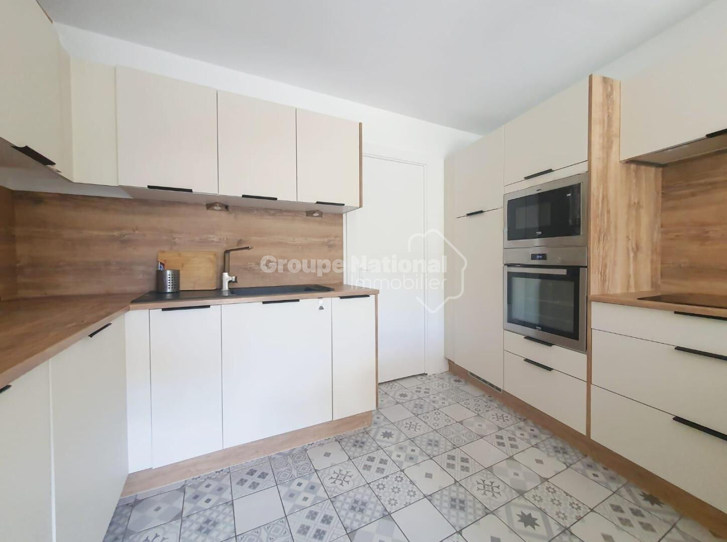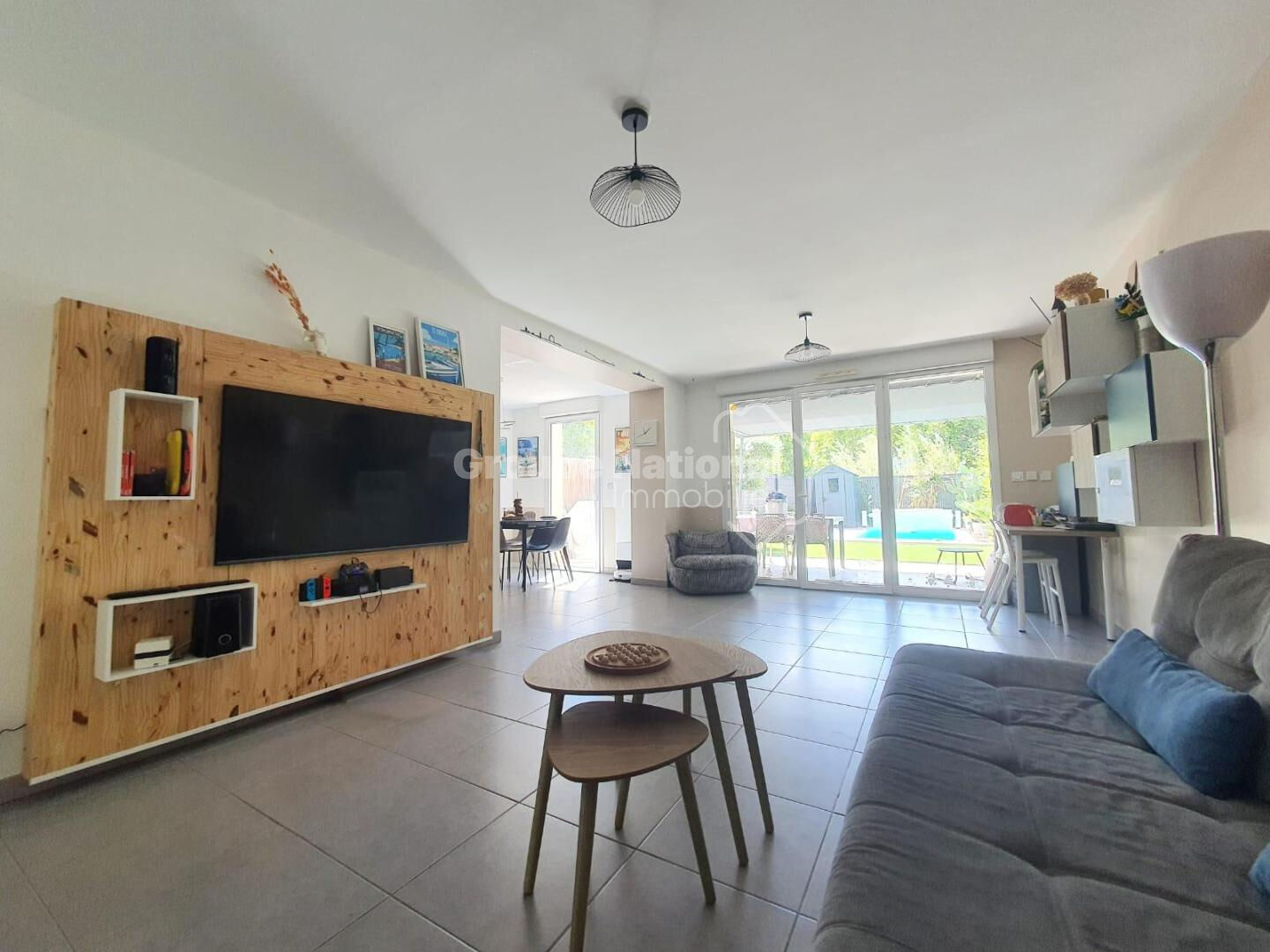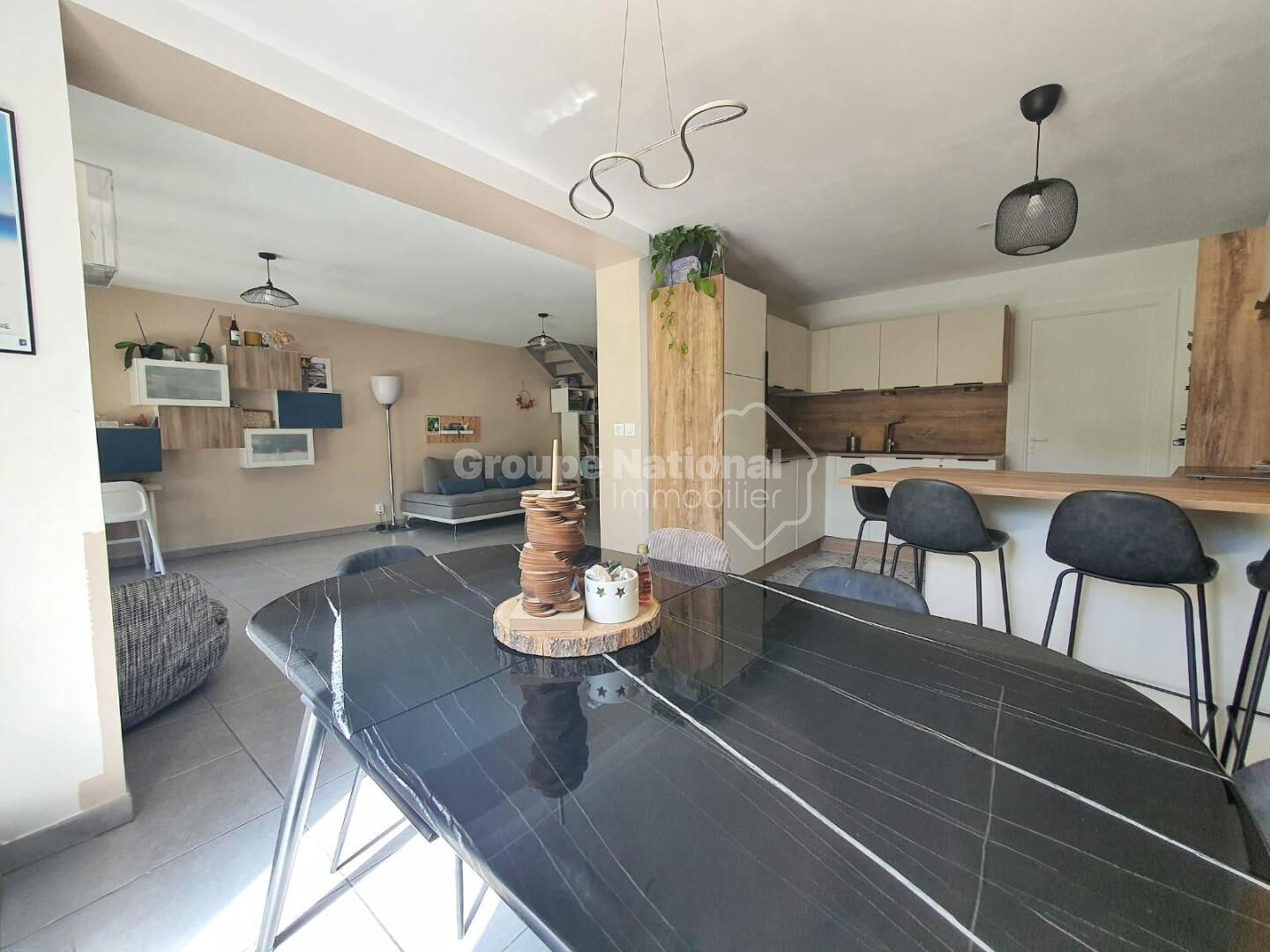 Une grande cuisine équipée ouverte sur un agréable salon avec baie vitrée