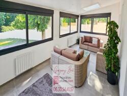 La maison se compose au rez-de-chaussée d'un salon séjour de plus de 40m2 équipé d'un poêle à pellet, un salon "style véranda'" de 30m2 très lumineux avec une très belle vue sur le jardin, une cuisine américaine moderne et équipée, une buanderie de 14m2 avec grenier de rangement, un wc indépendant avec lave main et une suite parentale de 26m2.