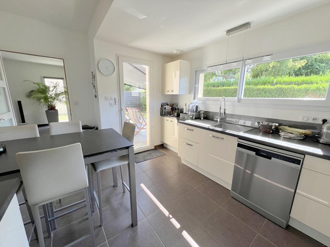 Au rez-de-chaussée, d'une entrée donnant sur une grande pièce de vie, avec une cuisine toute neuve, entièrement équipée et aménagée, avec une vue sur une grande terrasse en bois et un jardin. Une chambre avec salle d'eau privative, des toilettes séparées et un garage.