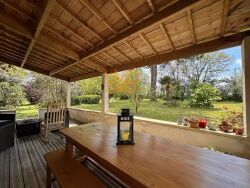 L'extérieur est une véritable invitation à la quiétude. Un superbe parc paysagé et arboré, sans aucun vis-à-vis, vous garantit une tranquillité parfaite. Imaginez vos longues soirées d'été sur la grande terrasse couverte ou vos soirées pizzas autour du four extérieur. Un vaste appentis/carport de plus de 80 m² avec espace atelier offre des possibilités d'aménagement infinies, que ce soit pour vos véhicules ou vos passions.