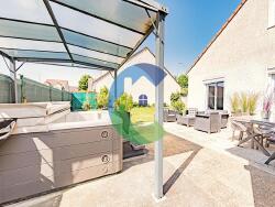 Vous serez séduit par son séjour cathédrale lumineux et sa cuisine moderne A/E donnant tous deux sur un bel espace jardin/terrasse et un coin jacuzzi. Egalement en RDC, vous pourrez profiter d'une belle suite parentale avec dressing et sa salle d'eau avec douche à l'italienne. Buanderie, garage double et un wc complètent le rez-de-chaussée. A l'étage, un palier desservant 2 chambres spacieuses avec rangements, une salle de bains, un wc séparé et une mezzanine pouvant faire office de bureau ou de coin lecture. Possibilité de créer une 4ème chambre dans les combles. Radiateurs électriques, fenêtres PVC double vitrage, volets roulants électriques. Climatisation dans les chambres. 2 places de stationnements devant la maison en plus du garage. Commerces et écoles (maternelle, primaire, collège et lycée) à proximité.