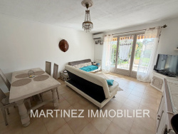 Dans une copropriété sécurisée et au calme, avec piscine, venez découvrir cette charmante maison mitoyenne lumineuse et en très bon état. Elle se compose, au rez-de-chaussée, d'un agréable premier jardin menant à l'entrée avec placard. Vous y trouverez également une cuisine aménagée, un WC indépendant, un grand espace de rangement supplémentaire ainsi qu'un séjour lumineux de 24 m2 exposé plein sud, ouvrant sur une terrasse puis sur un second jardin. À l'étage, l'espace nuit propose une première chambre avec grande penderie, un deuxième WC indépendant, une salle de bains et une seconde chambre de 15 m2 avec placard. Cette dernière donne accès à une terrasse offrant une vue dégagée avec un aperçu mer. Un garage ainsi qu'une place de stationnement devant la maison complètent ce bien.