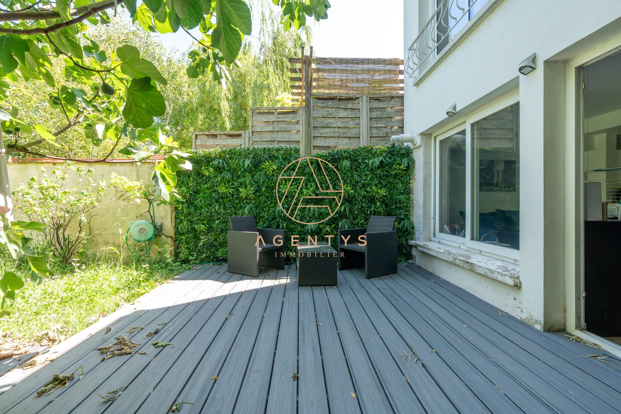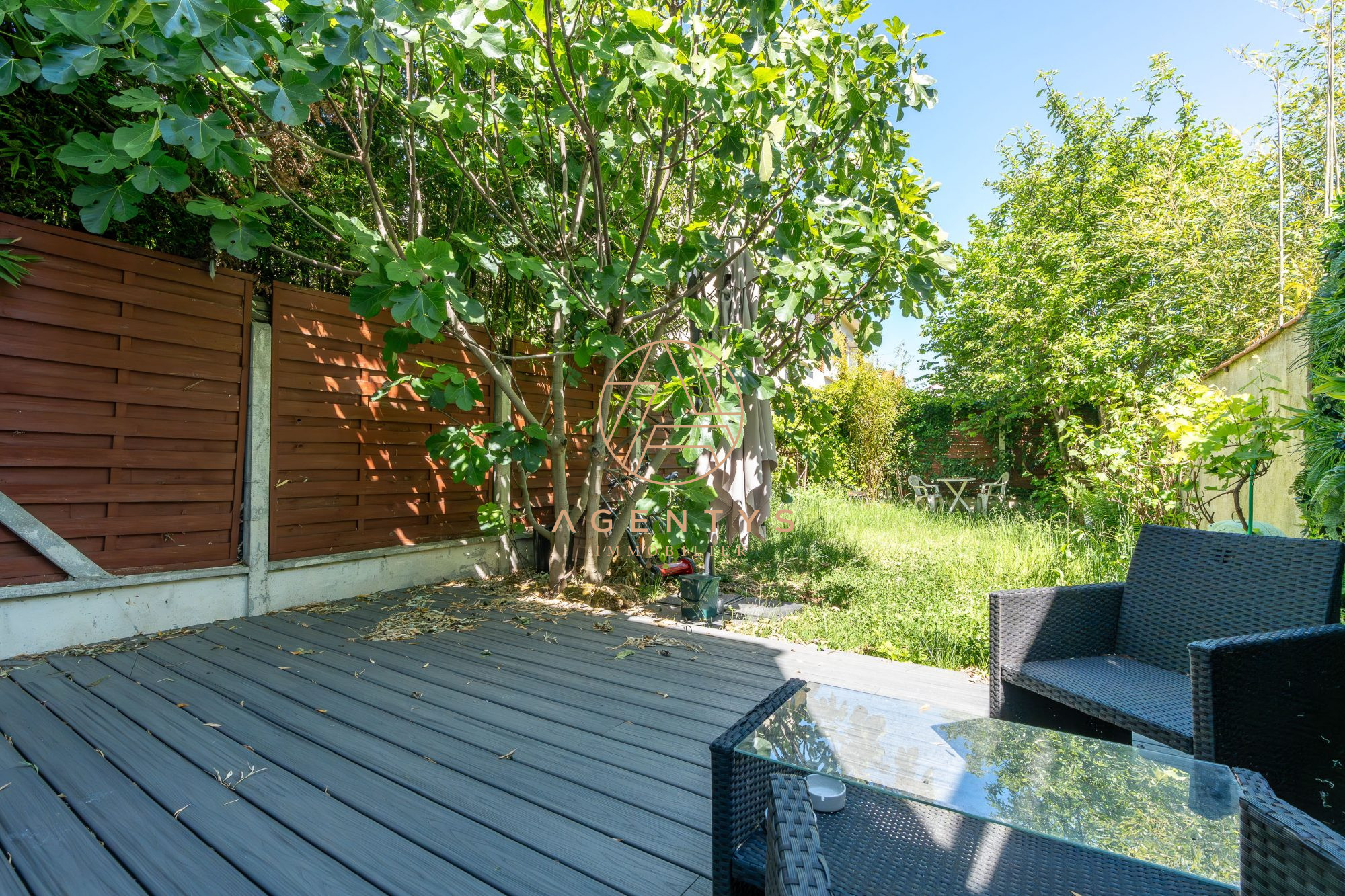 Trois espaces de détente vous attendent dans le jardin, avec une seconde terrasse de 35m² et sa pergola couverte de vigne vierge, une aire de jeux en gazon et un potager habilement dissimulé tout au fond de la parcelle.