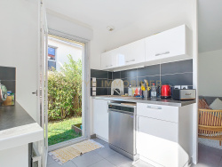 Terrasse aménagée de 15 m2. Abri de jardin. Garage attenant. Place de stationnement privative.