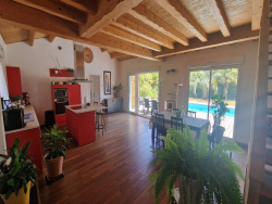 A 8 minutes de CHALLANS et 15 minutes des belles plages, située sur la commune de CHATEAUNEUF au bout d'une impasse, dans un quartier tranquille et à proximité des commodités, cette maison contemporaine se distingue par ses volumes spacieux et baignés de lumière. L'entrée s'ouvre vers une vaste pièce de vie de près de 80 m2 avec sa cuisine parfaitement équipée et fonctionnelle, idéal pour préparer de délicieux repas en famille ou entre amis. De plus elle est agrémentée d'un poêle à bois créant une ambiance chaleureuse et conviviale. On trouve également trois chambres, dont une suite parentale de 32,5 m2 comprenant dressing, salle d'eau avec wc ainsi qu'une pièce annexe actuellement dédiée au sport; une seconde salle d'eau avec wc, un cellier, un wc indépendant, ainsi qu'une salle de jeux ou chambre supplémentaire. À l'étage, une chambre et une salle de bains avec wc complètent l'ensemble. Enfin, vous pourrez profiter d'un jardin clos de 1000 m2 d'un style méditerranéen avec sa piscine et ses dépendances. En résumé: Maison avec 5 chambres confortable pour une grande famille ou une famille classique avec 3 chambres + un bureau + salle de jeux. Visite virtuelle disponible sur le site de l'Agence. Honoraires à la charge du vendeur. Lien géorisque: https://www.georisques.gouv.fr/
