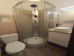 Salle d'eau rénovée avec douche et toilettes.