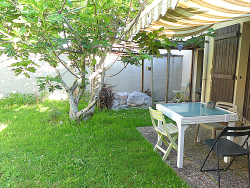 Garage, terrasse et jardin avec arbres fruitiers.