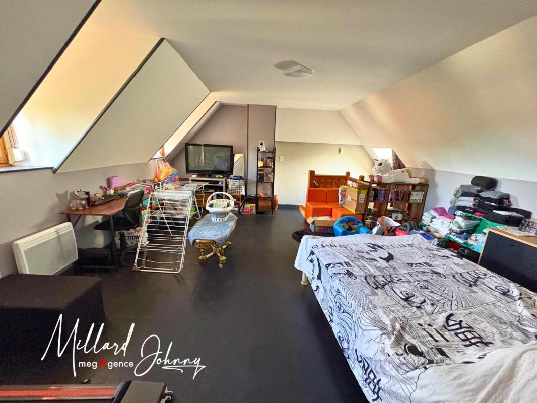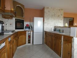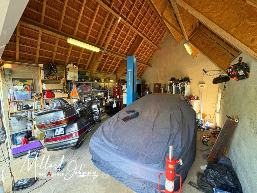 _ une pièce de vie de 45 m2 avec cuisine ouverte, cellier, 3 chambres, salle d'eau, wc, et un grand garage.