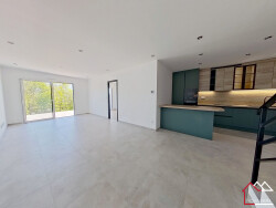 Surface totale de 122m² : Spacieuse et lumineuse, avec un grand salon ouvert sur une cuisine moderne, offrant un espace convivial et fonctionnel. Chambres : Trois chambres dont une suite parentale avec salle d'eau privative et espace dressing, idéal pour votre intimité et confort. Salles d'eau : Deux salles d'eau, parfaitement agencées. Buanderie : Un espace pratique pour le rangement et vos besoins quotidiens. Garage : Un garage privé pour sécuriser vos véhicules et vos affaires. Extérieur : Terrasse et jardin ensoleillée, parfait pour profiter de moments en plein air. Stationnement supplémentaire devant la maison. Énergie et chauffage : Équipée d'une pompe à chaleur et d'un système de chauffage et raffraichissement au sol, cette maison garantit une performance énergétique optimale, vous permettant de réaliser des économies sur vos factures tout en respectant l'environnement. Mitoyenne d'un coté