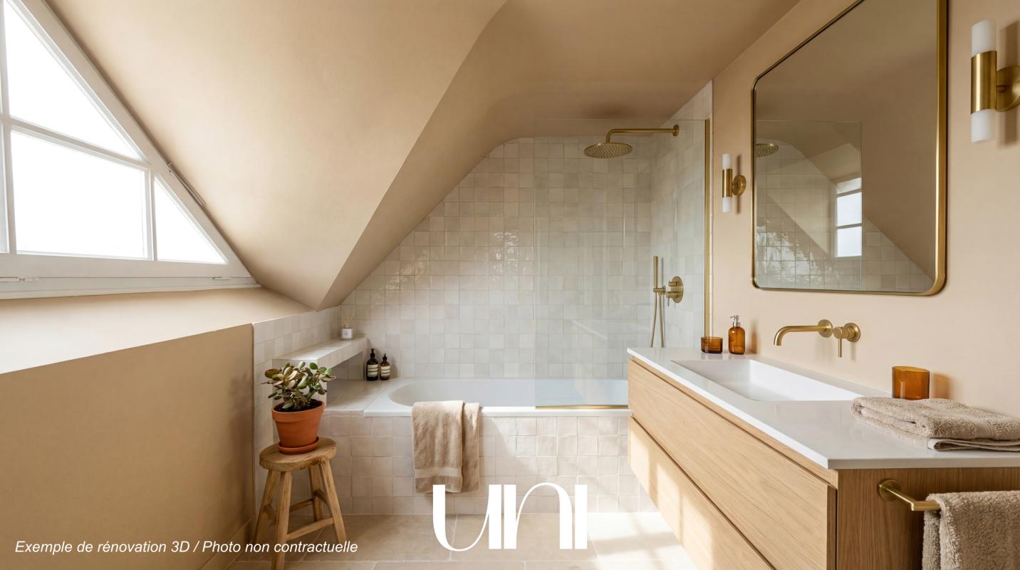 À l'étage, un palier lumineux distribue trois grandes chambres (entre 13,5 et 14 m²), une spacieuse salle de bains avec douche, double vasque, et un WC indépendant.