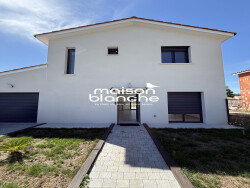 Composée d'une entrée, d'un séjour avec cuisine ouverte, d'un WC, et d'un garage au rez-de-chaussée. À l'étage, trois chambres et une salle d'eau avec WC.