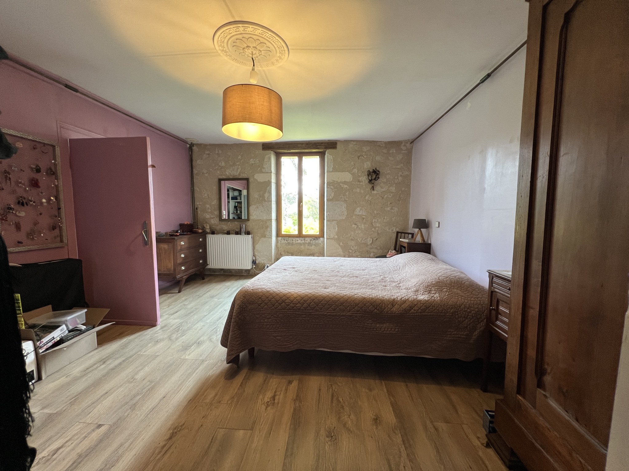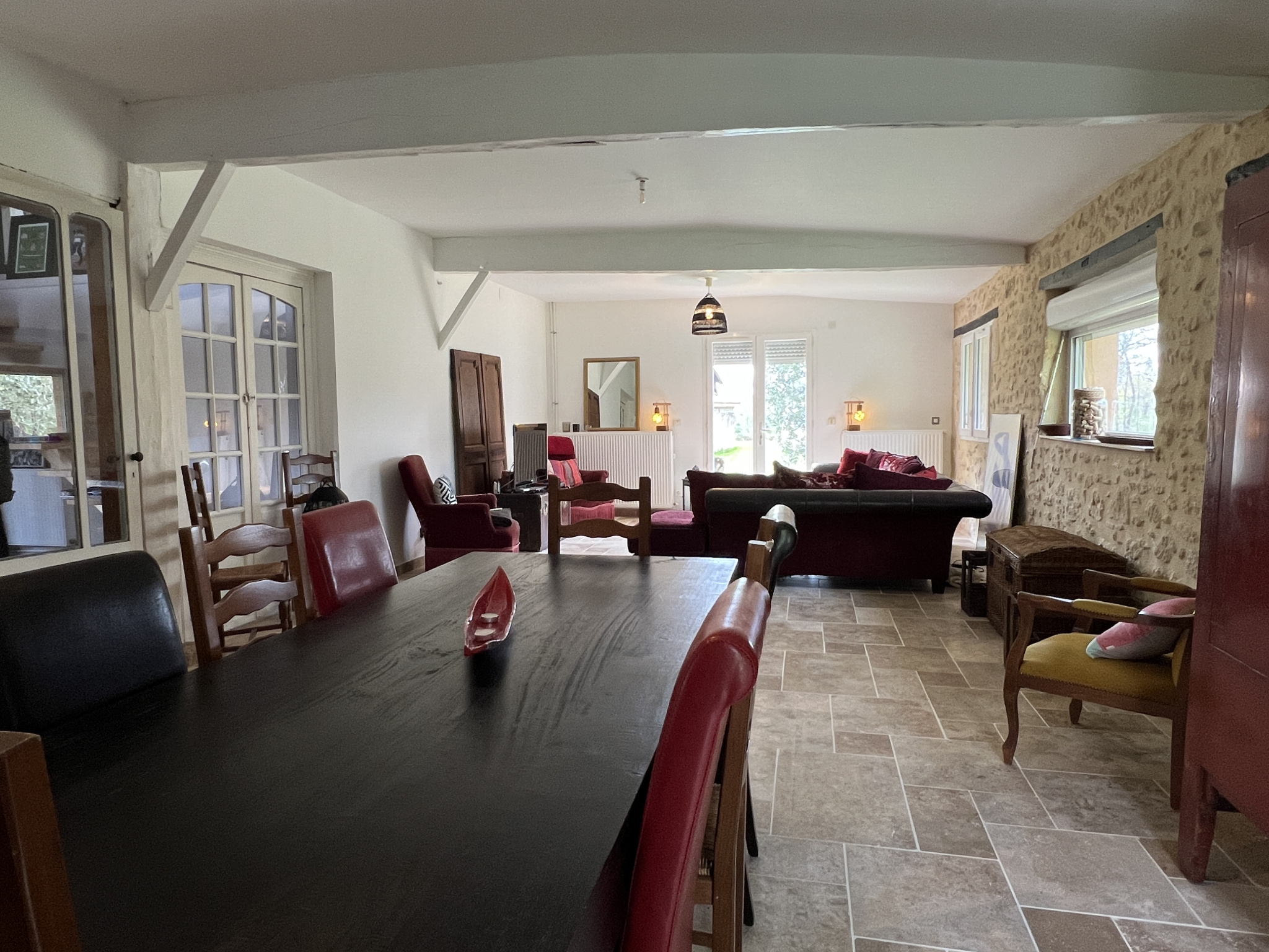 Maison pierre rénovée et parfaitement habitable sur un beau parc de 2,24 ha en partie boisé et aménagé avec soin. Elle se compose d'un vaste séjour avec mezzanine/bureau, cuisine aménagée avec cheminée donnant sur coin terrasse, 4 chambres, salle d'eau, salle de bains, 3 toilettes, abri voiture, cellier pour jardin. Assainissement individuel ok, raccordé fibre. Accès facile.
