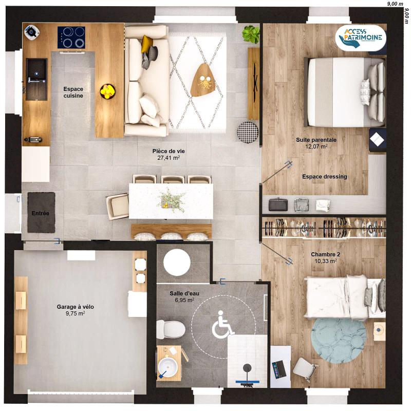 Inclus : grande baie vitrée, volets roulants électriques, chauffage économique avec plancher chauffant, meuble vasque avec mitigeurs Hansgrohe, faïences jusqu'à 30x90 et carrelage jusqu'à 60x60.