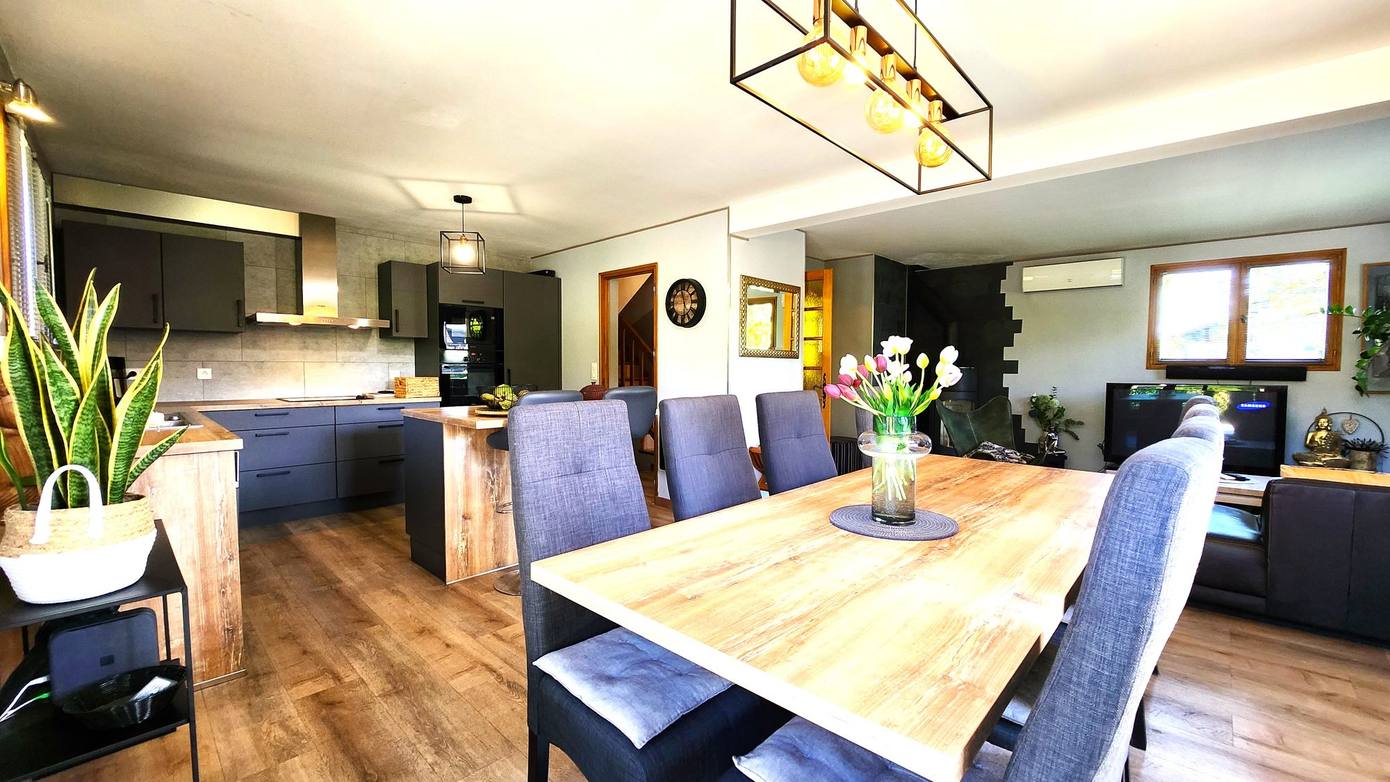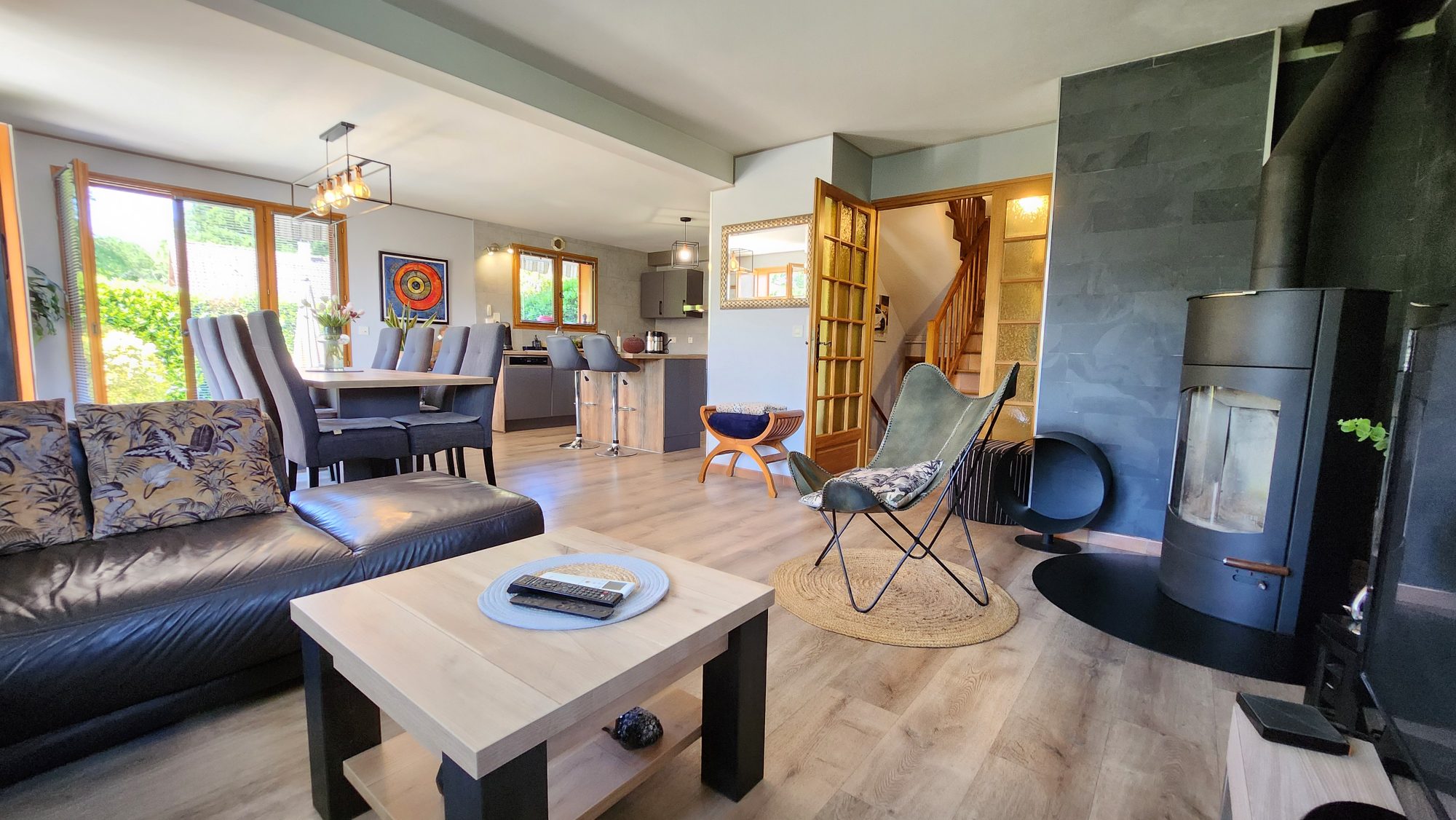 Elle dispose d'un bel espace de vie lumineux. agrémenté d'un poêle à bois. ouvrant sur une première terrasse. La cuisine semi-ouverte. aménagée et équipée. donne sur une seconde terrasse. idéale pour profiter des repas en extérieur. Côté nuit. vous trouverez quatre chambres. une salle d'eau moderne. des WC séparés et un cellier-buanderie.