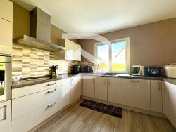 Stéphane Plaza Immobilier Colmar-Sud vous propose en exclusivité à Bollwiller cette agréable maison individuelle de plain-pied, construite en 2016 en ossature bois, conforme à la réglementation thermique RT 2012. D'une surface de 93 m² sur un terrain de 4,77 ares, elle se compose de cinq pièces dont trois chambres. L'entrée avec placard intégré ouvre sur une belle pièce de vie baignée de lumière, regroupant séjour, salle à manger et cuisine ouverte, aménagée et équipée. L'espace nuit comprend trois chambres, une salle d'eau avec toilette suspendu, ainsi qu'un cellier fonctionnel. A l'extérieur, la maison bénéficie d'un cadre de vie plaisant : une terrasse de 25 m² idéale pour les beaux jours, un espace potager, un abri de jardin, un garage de 16 m² et plusieurs places de stationnement. Chauffage au sol au gaz, menuiseries en PVC double vitrage, volets motorisés dans les pièces principales. Une maison saine, économe et bien entretenue, dans un environnement calme et résidentiel. Pour tout renseignement ou pour organiser une visite, contactez Stéphane Plaza Immobilier Colmar-Sud. (6.00 % honoraires TTC à la charge de l'acquéreur.) Matteo MAGALHAES (EI) Agent Commercial - Numéro RSAC : 924 193 844 - COLMAR.
