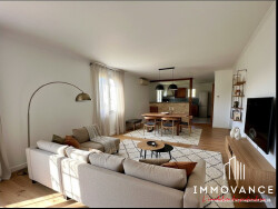 L'espace de vie chaleureux de 48m² offre un séjour avec cheminée , une cuisine semi ouverte équipée et son cellier attenant .
