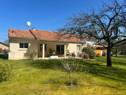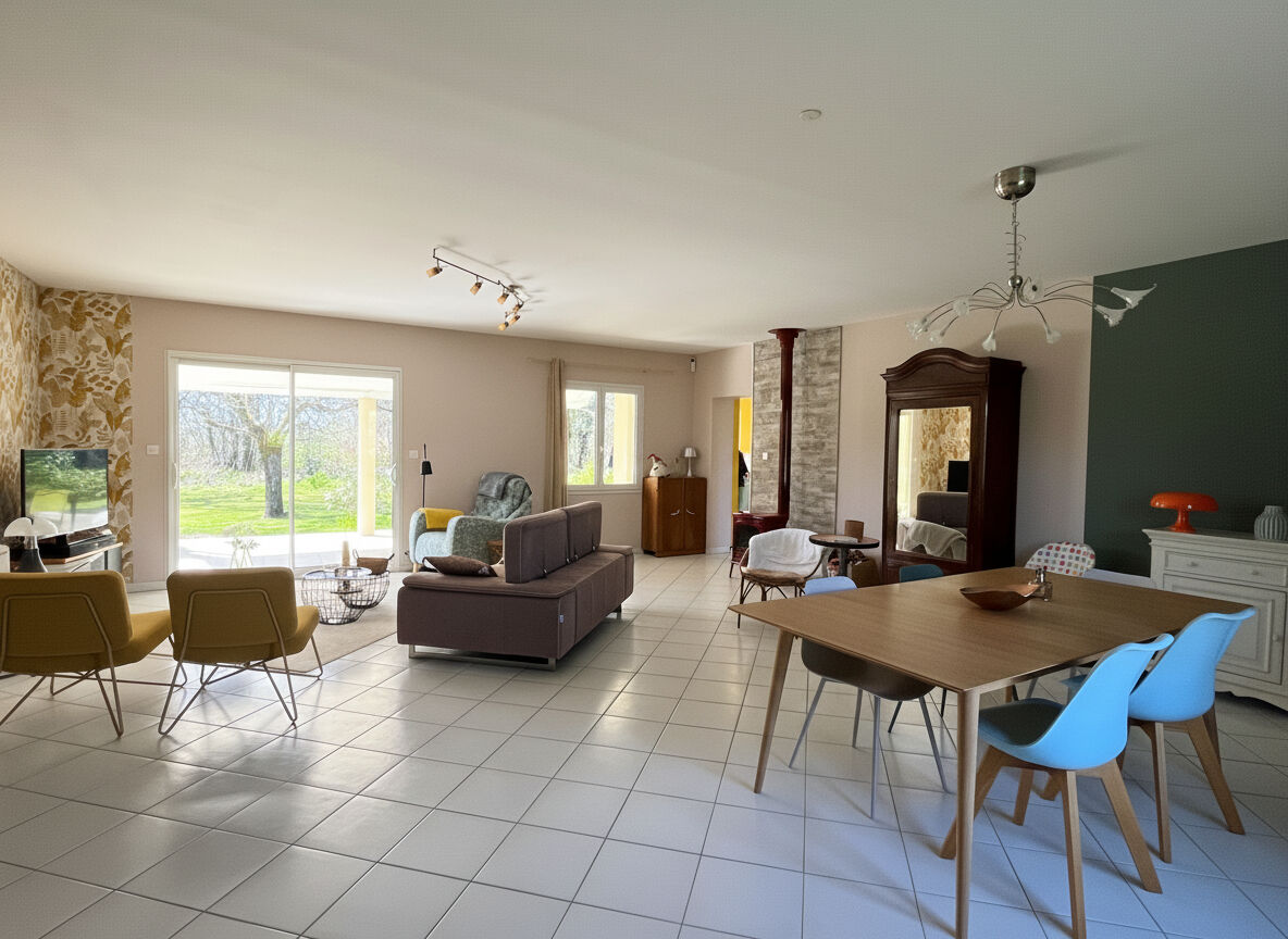 JOLIE MAISON Contemporaine de 114 m² habitables + un HANGAR attenant de 130 m² sur un Terrain de 2 066 m² La MAISON se compose en Rdc d'une PIECE à Vivre de 50 m² (SALON/SEJOUR/CUISINE) donnant sur une Terrasse avec une Piscine, une CHAMBRE, une Salle d'Eau, un Wc séparé, une Buanderie A l'étage, une Mezzanine et une CHAMBRE avec un WC/Lavabo (possibilité d'installer une douche) Un HANGAR attenant de 130 m², (isolé toIture et murs) pouvant accueillir du stockage ou faire un agrandissement de la maison.