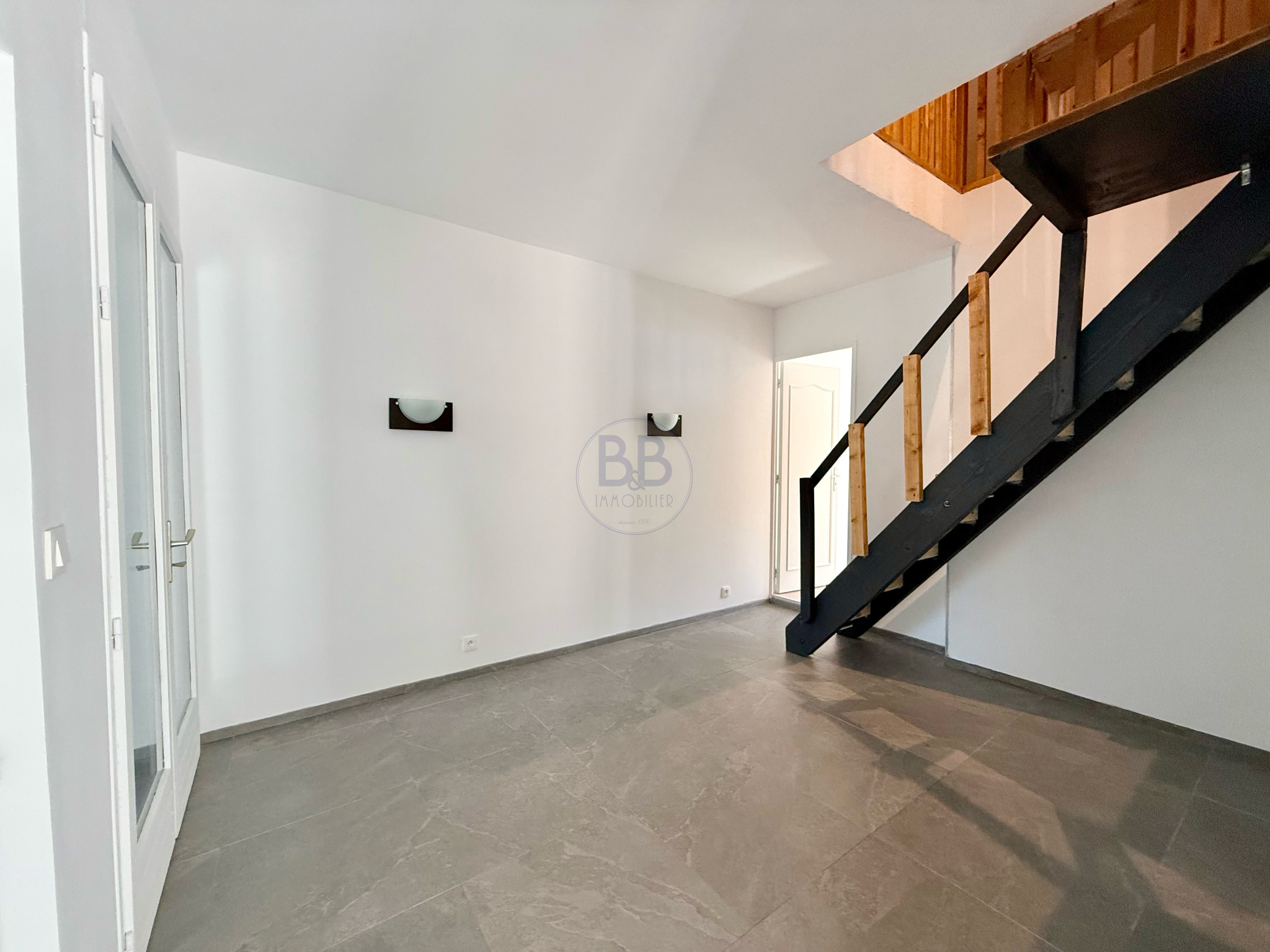 PORT FREJUS et MER, Dans une impasse au calme , maison mitoyenne garage accés direct dans la maison, en rez de chaussée : une entrée, cuisine séparée équipée, double séjour, wc, terrase et jardin a l'étage trois chambres dont une avec terrasse, salle d'eau, wc,