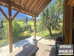 A quelques minutes du Lac d'Aiguebelette - Dans un petit hameau, maison individuelle construite en ossatures bois, de 176 m2 habitables. La maison est aujourd'hui configurée en deux logements mais peux aisément retrouver la configurer familiale d'origine. Premier logement principal composé d'un grand séjour avec cuisine ouverte, jardin d'hiver, une salle d'eau avec WC, deux chambres sous rampants à l'étage avec WC indépendant. Le second logement, régulièrement loué en saisonnier, propose une pièce à vivre avec cuisine équipée, trois chambres à l'étage dont une avec mezzanine, salle d'eau et WC. Les deux logements dispose d'une vaste terrasse abritée, de plain pied. Le terrain est entièrement clos, l'environnement est très calme et ensoleillée. Une annexe indépendante, permet le stationnement abrité de deux véhicules et la cour permet le stationnement de nombreux véhicules supplémentaires. L'ensemble est en très bon état général.